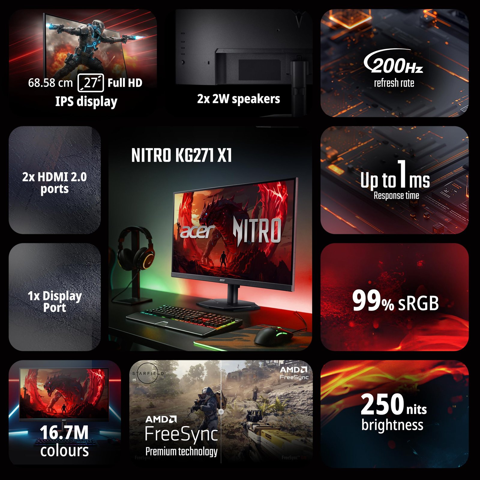 - 【Full HD】The Full HD resolution (1920 x 1080) with IPS Panel ensures a sharp and smooth gameplay experience, even at the highest settings, Support HDR 10 format and SRGB 99%, having wide view angle of 178 Degrees with 250 nits Brightness