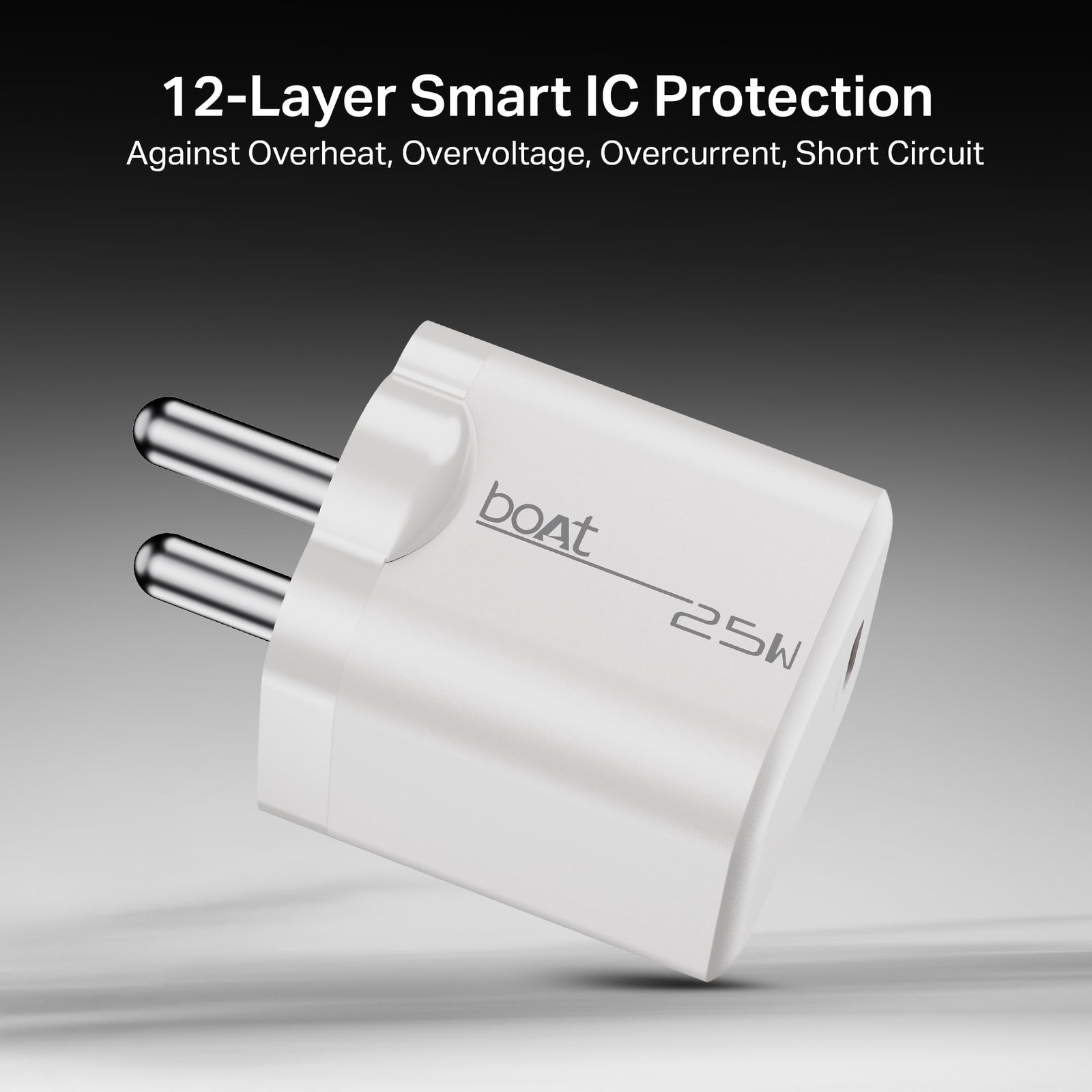 Details: Experience charging that keeps up with your pace. Meet the boAt 25W PD Fast Charger – built to deliver speed, safety, and durability. With 25W fast charging support and advanced protocols like PD and PPS, it ensures efficient power delivery across a wide range of compatible devices. The charger is equipped with auto-detect charging technology that intelligently adjusts the output based on your device’s requirements, thus protecting your battery health. Its ultra-compact and lightweight build ensures easy portability—perfect for both everyday use and travel. Meanwhile, corrosion-resistant and rust-free pins enable stable performance even in challenging humid environments. Smart on the inside, the charger features intelligent power and heat management, efficiently distributing power while preventing overheating. This not only protects your devices but also enhances long-term performance. With Smart IC Protection, it safeguards against overvoltage, overcurrent, overheating, and short circuits—giving you peace of mind every time you plug in. Its scratch- and heat-resistant body offers durability, making it a long-lasting addition to your daily tech setup. From your morning hustle to those unplanned weekend getaways, our 25W PD Charger keeps your devices powered wherever life takes you. Trusted by millions of boAtheads globally, it’s a compact essential for everyday use. For fast, safe, and smart charging— trust the boAt 25W PD Charger.