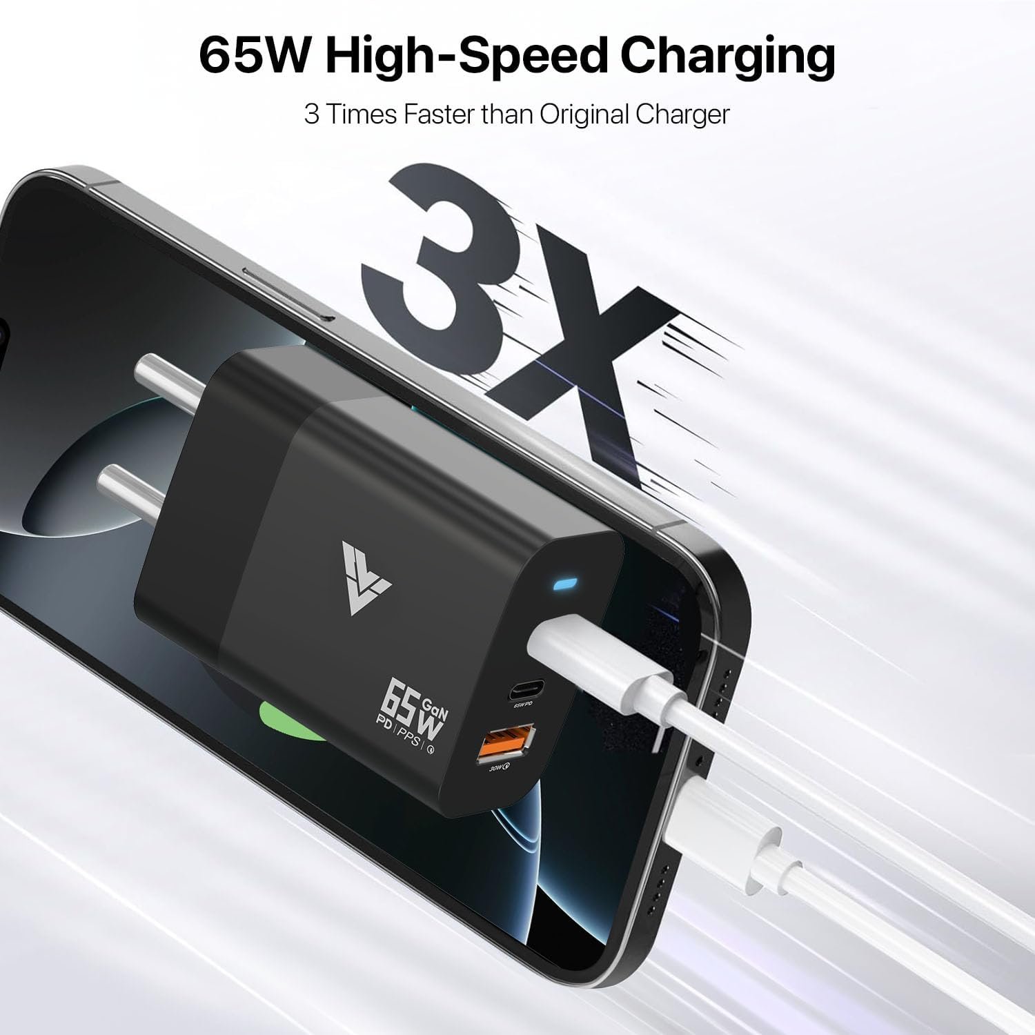 - 【Efficient & Fast Charging】65W USB C charger to charge your device at lightning-fast speeds, with a single device output of up to 65W. It takes just 2 hours to fully charge your MacBook Pro and only 25 minutes to charge your iPhone up to 55%. This USB C charger block supports PD3.0, QC3.0, unlocking the best charging effect and bringing you the most efficient and fastest charging experience.
