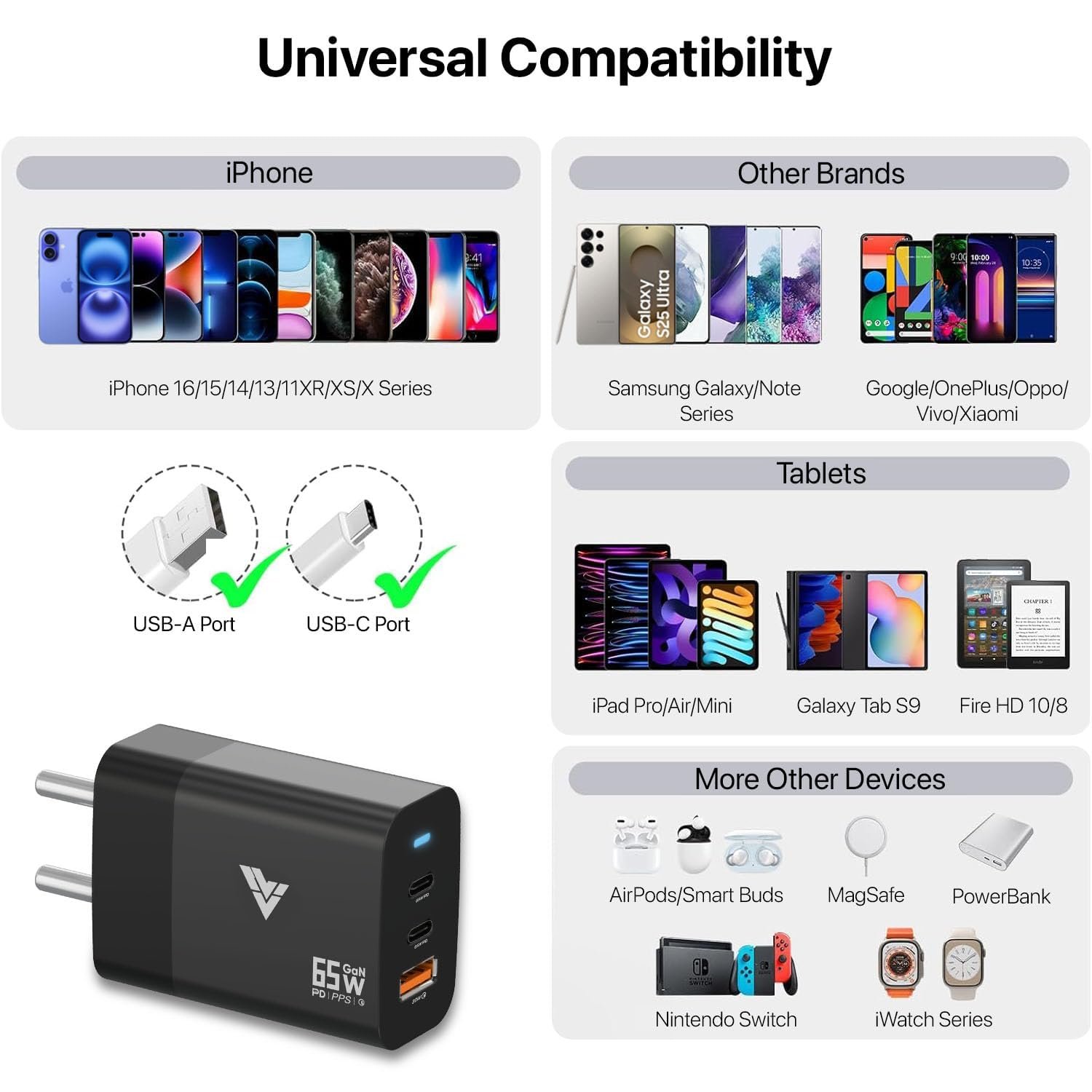 - 【All-in-One & Multi-Port Charger】Just a 3-port USB C charger can perfectly upgrade your charging configuration. With 2 USB-C ports and 1 USB-A port, making it easy to fast charge phones, ipads, and laptops simultaneously. Charging output power depends on different port combinations, allowing you to achieve the best performance and get the fastest charging time based on actual charging needs.
