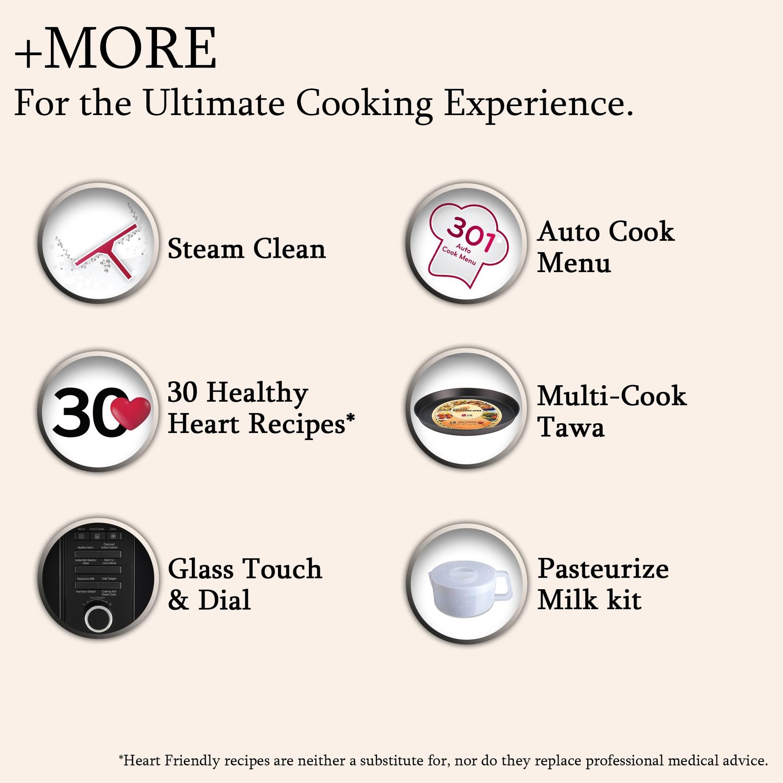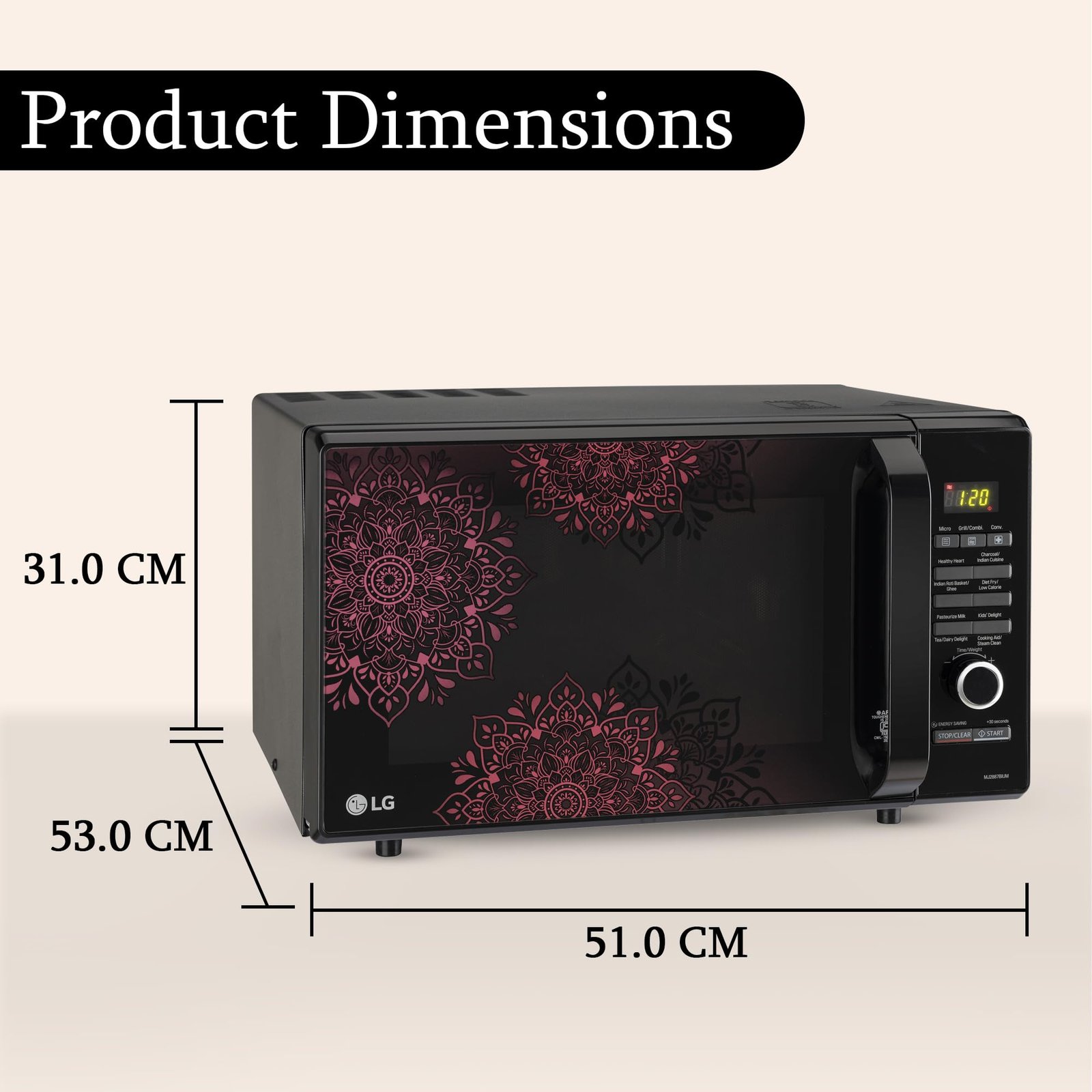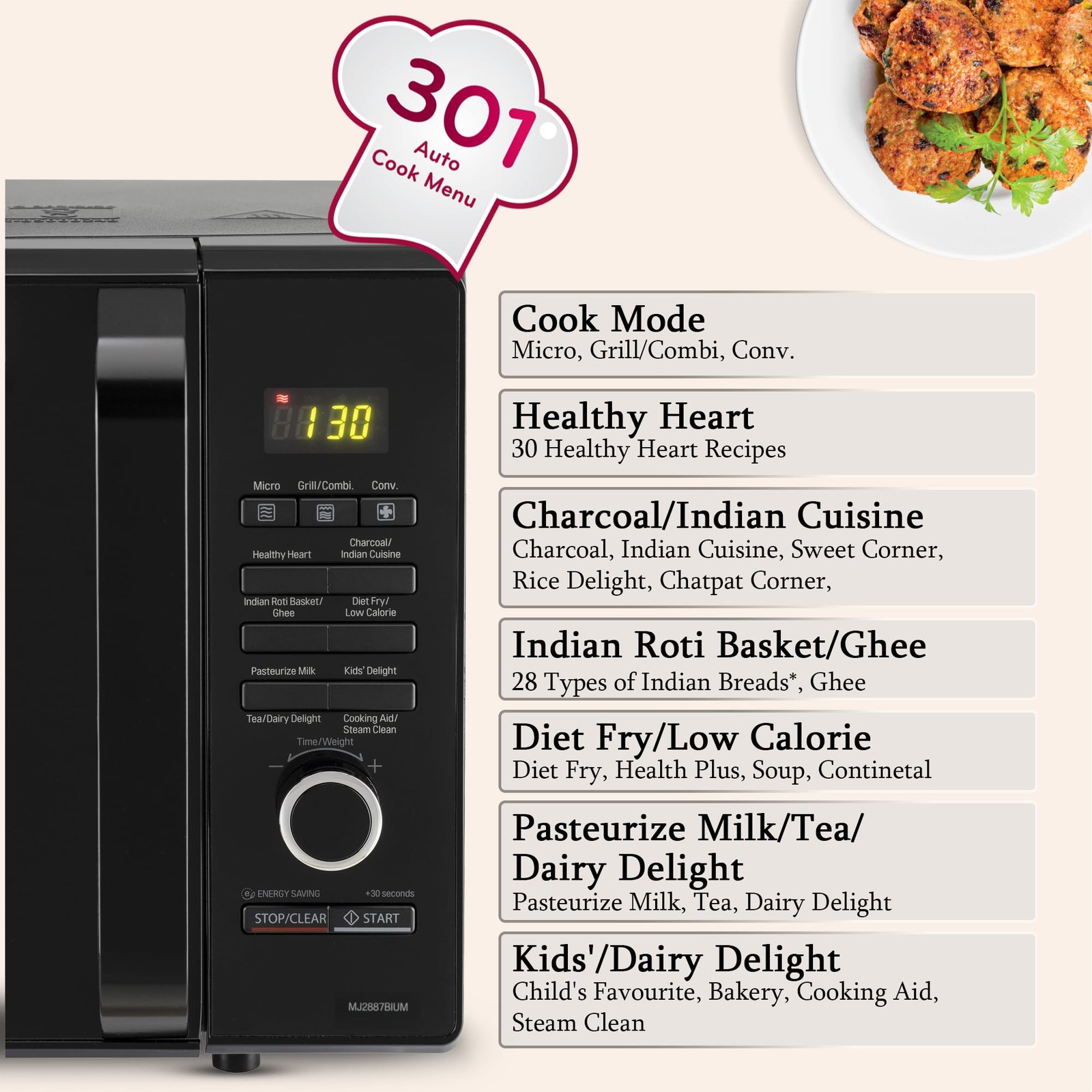 - Number of Programs & Panel Information: Cook Mode – Micro, Grill Combination, Convection | Healthy Heart | Charcoal/Indian Cuisine | Indian Roti Basket/Ghee | Diet Fry / Low-Calorie Mode | Pasteurize Milk/Tea/Dairy Delight Mode – Pasteurized Milk, Tea, Dairy Delight | Kids’ Delight/Cooking Aid/Steam Clean| Panel information: Dial (More/Less), STOP/Cancel/Child Lock – Clears all functions and set entries except time of the day. Press & Hold button for 3 seconds to activate child lock, Start/Select/+30 seconds