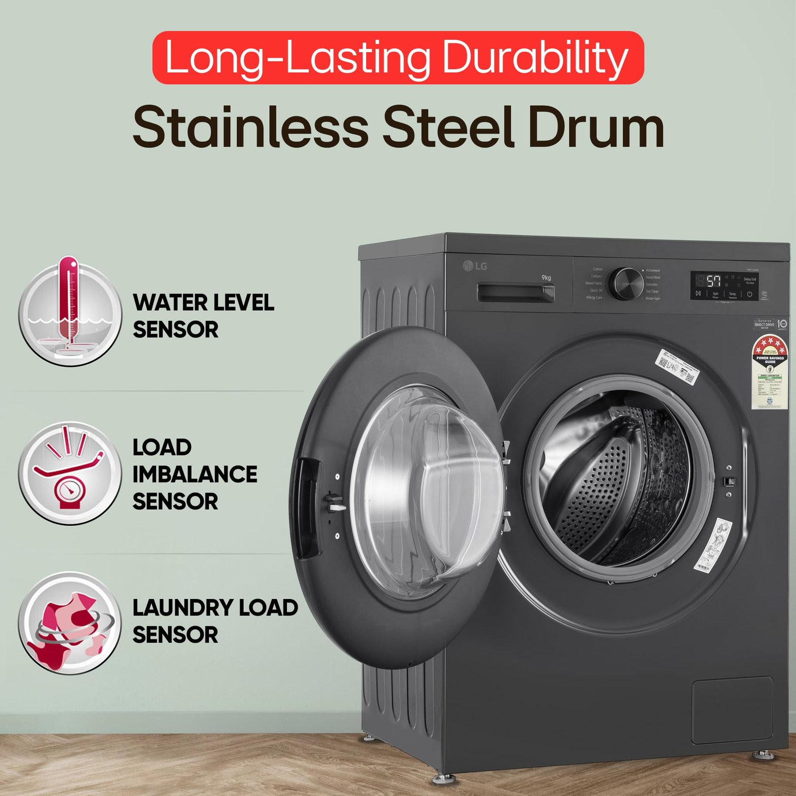 - Fully-automatic front load washing machine with Hygiene Steam/direct-drive technology: Best Wash Quality, Energy and Water efficient