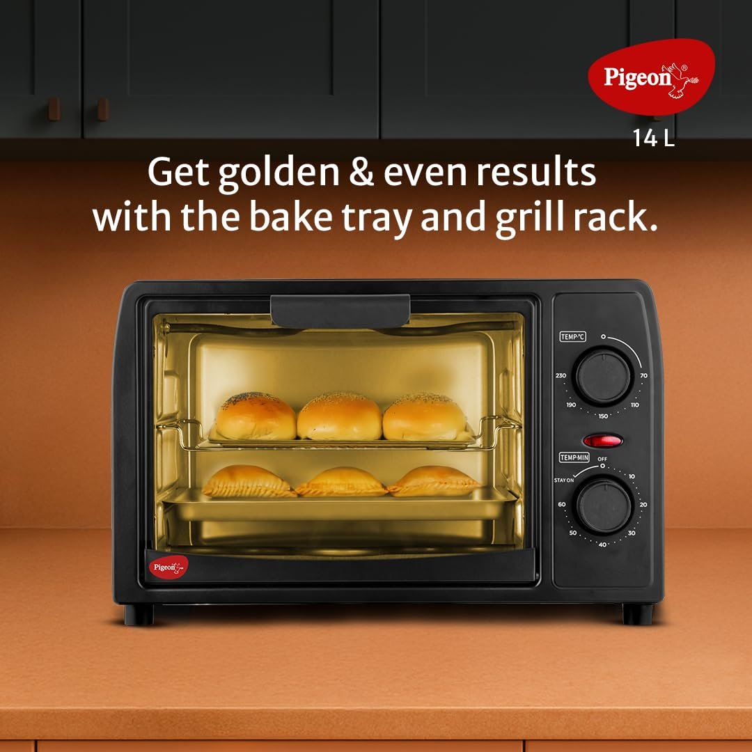 Pigeon Oven Toaster Grill 14 Liters OTG| 900 Watts| Toast, Grill, Bake & Roast | Heat Resistant Tempered Glass| Black