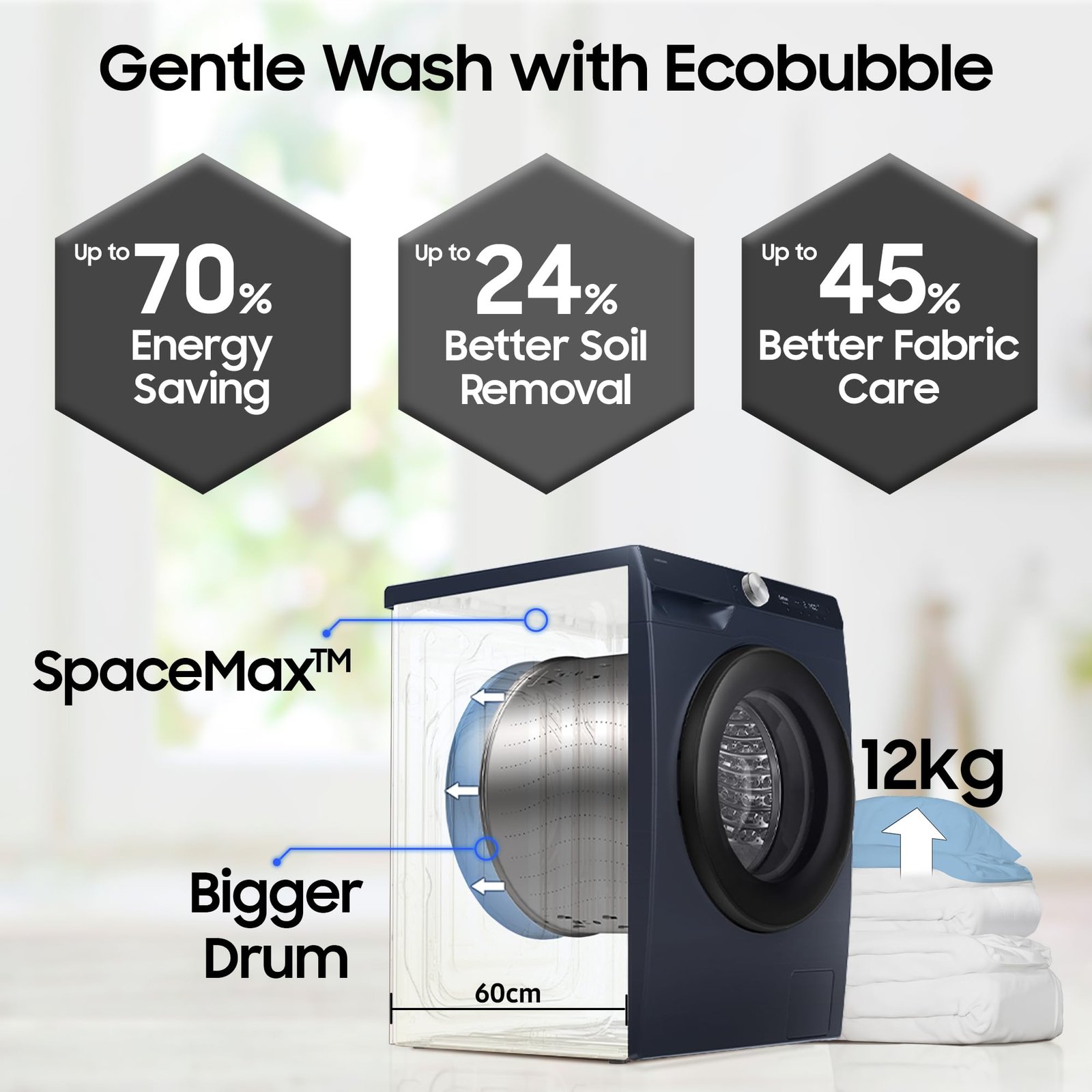 - Key Performance Features: AI Ecobubble with 45% better fabric care| AI Energy Mode for up to 70% energy savings | AI Control | Wi-Fi Embedded – Operate remotely| Smartthings for home integration| Hygiene Steam| Super Speed – Wash is just 39 minutes | SpaceMax – Creates more space inside to incorporate a larger drum| Quick Wash| Bubble Soak| Drum Clean+ Removes dirt and 99.9% of odor-causing bacteria| In-built Heater for Hot & Cold wash