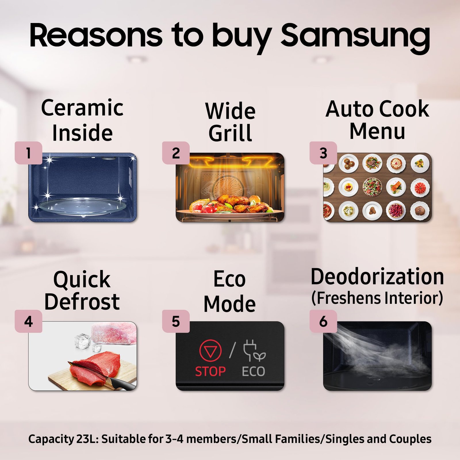 - Manufacturer Warranty: 1 Year on Product & 10 Years on Ceramic Enamel Cavity (T&C Apply) | Enjoy peace of mind with Samsung’s long-lasting ceramic enamel cavity, ensuring durability, easy cleaning, and hygienic usage. (Note: Brand Warranty can be availed using seller invoice)