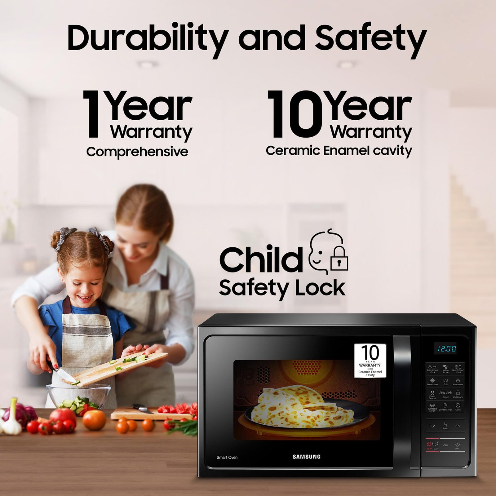 - Manufacturer Warranty: 1 year on product, 10 Years on Ceramic enamel cavity. (T&C Apply) | Enjoy peace of mind with Samsung’s long-lasting ceramic enamel cavity ensuring durability, easy cleaning, and hygienic usage. (Note: Brand Warranty can be availed using seller invoice)