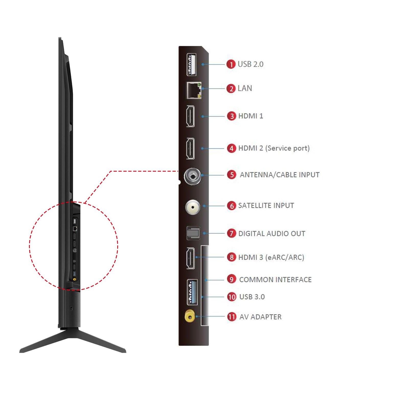 - Connectivity: 3 HDMI Ports | 1 USB port | 1 JSB | 1 Lan | 1 Antenna Input | | 1 Digital Audio Out | 1 AV Adapter